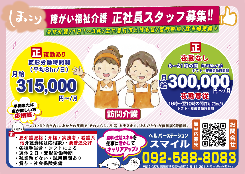 スマイルチームに参加希望の方は、求人お問い合わせからのご連絡、もしくはお電話・メール・ファックスをお願いします。